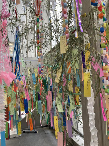 特大の笹竹に、来館者約450人が短冊に願いをしたためました。